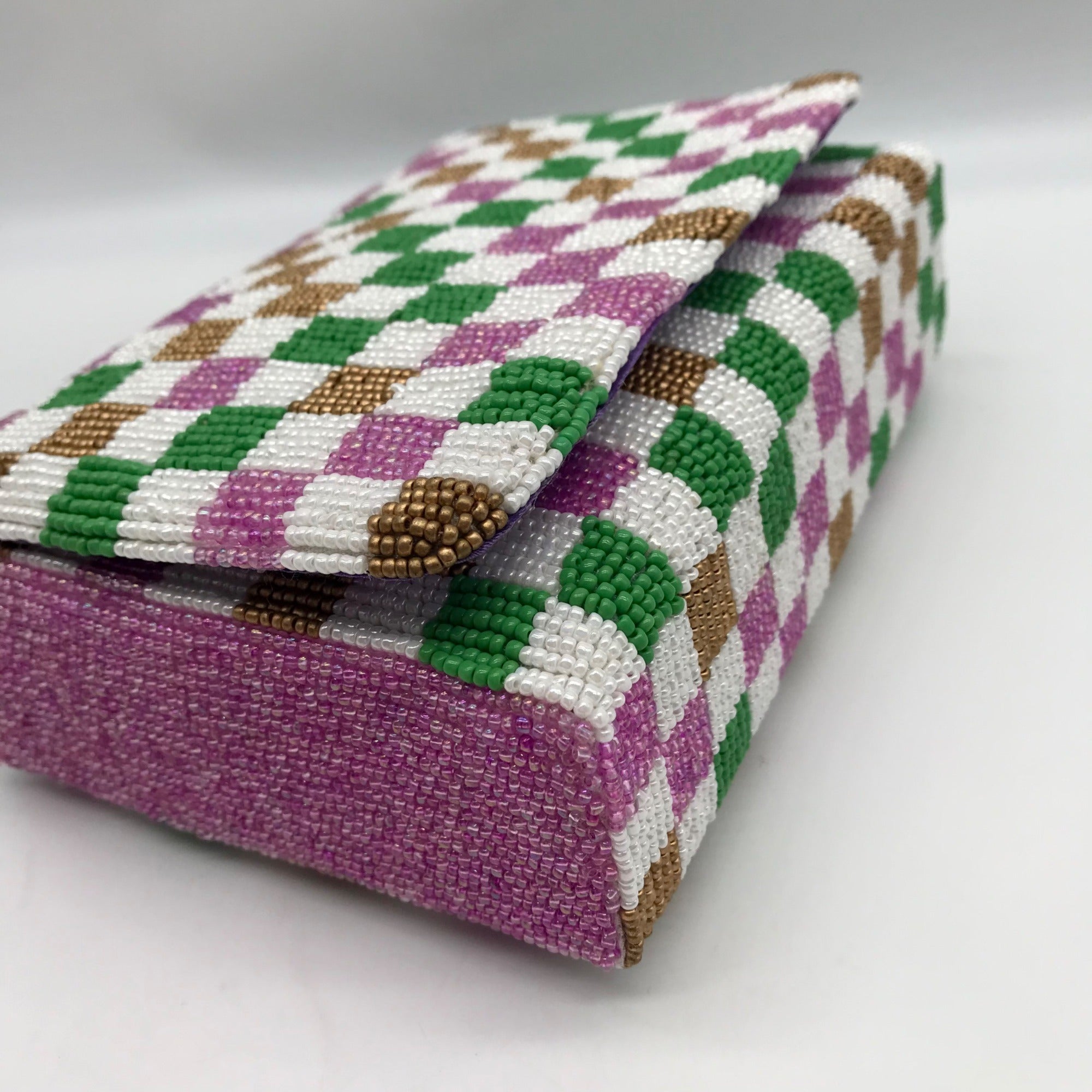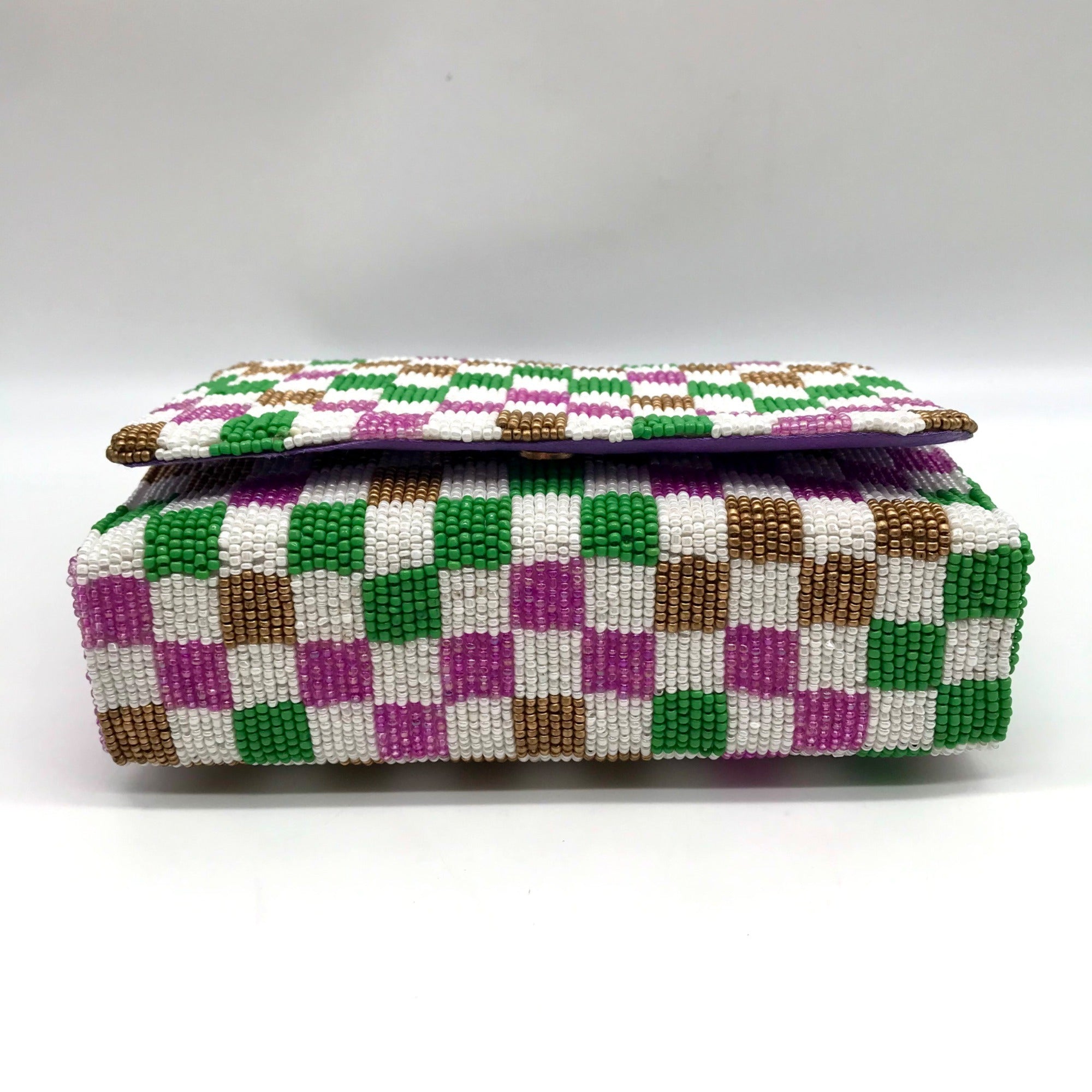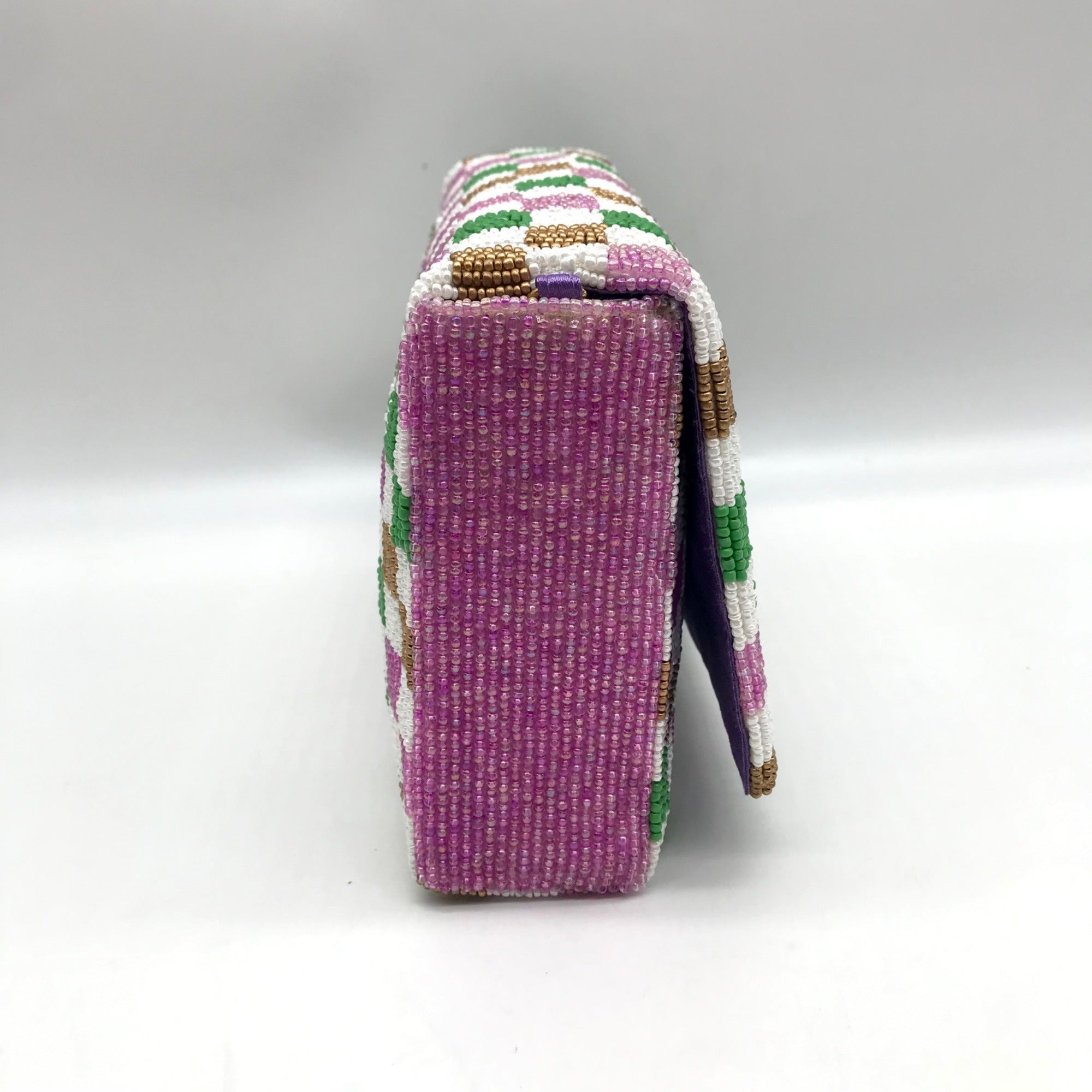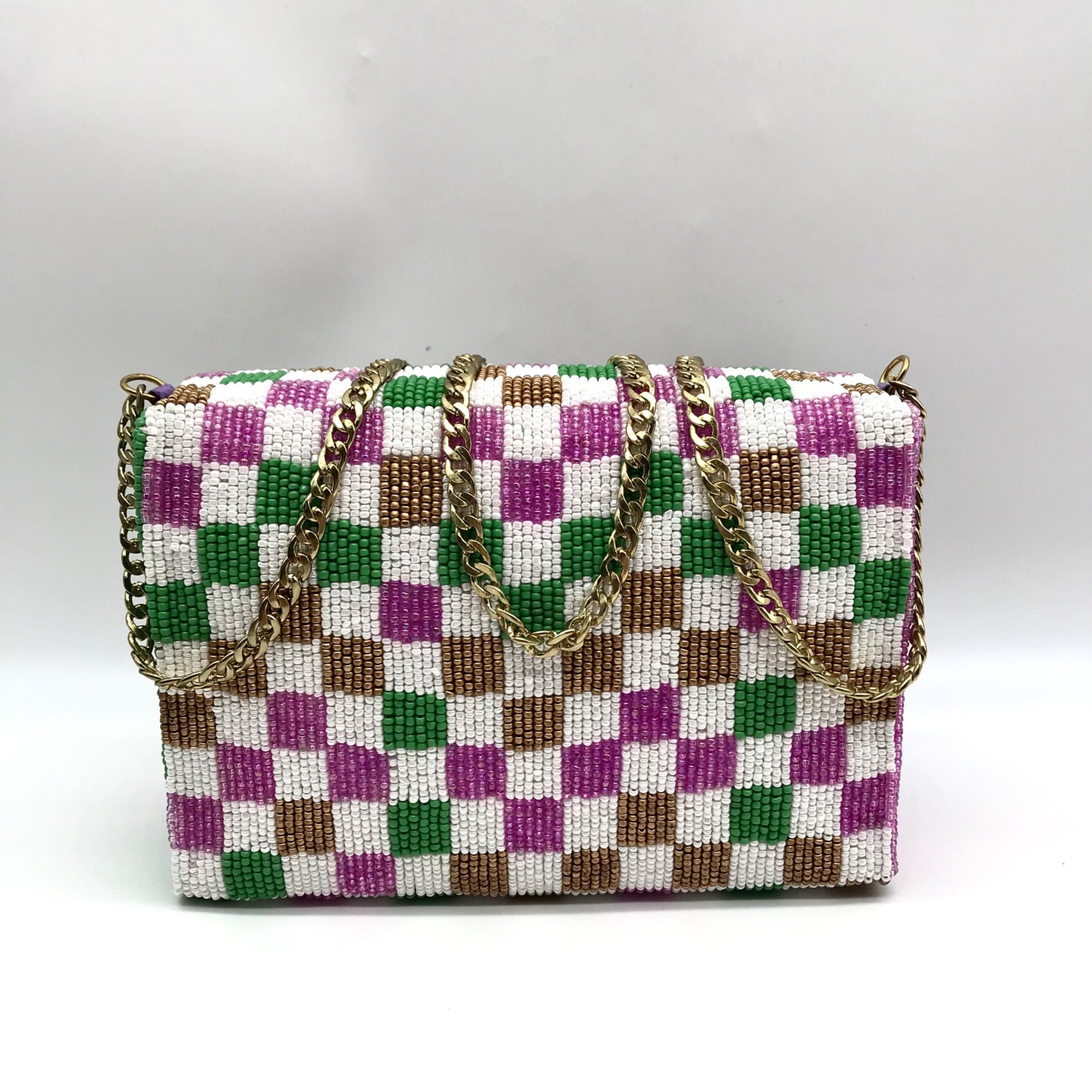 Moyna Purple Beaded Mardi Gras Checkered Crossbody Bag