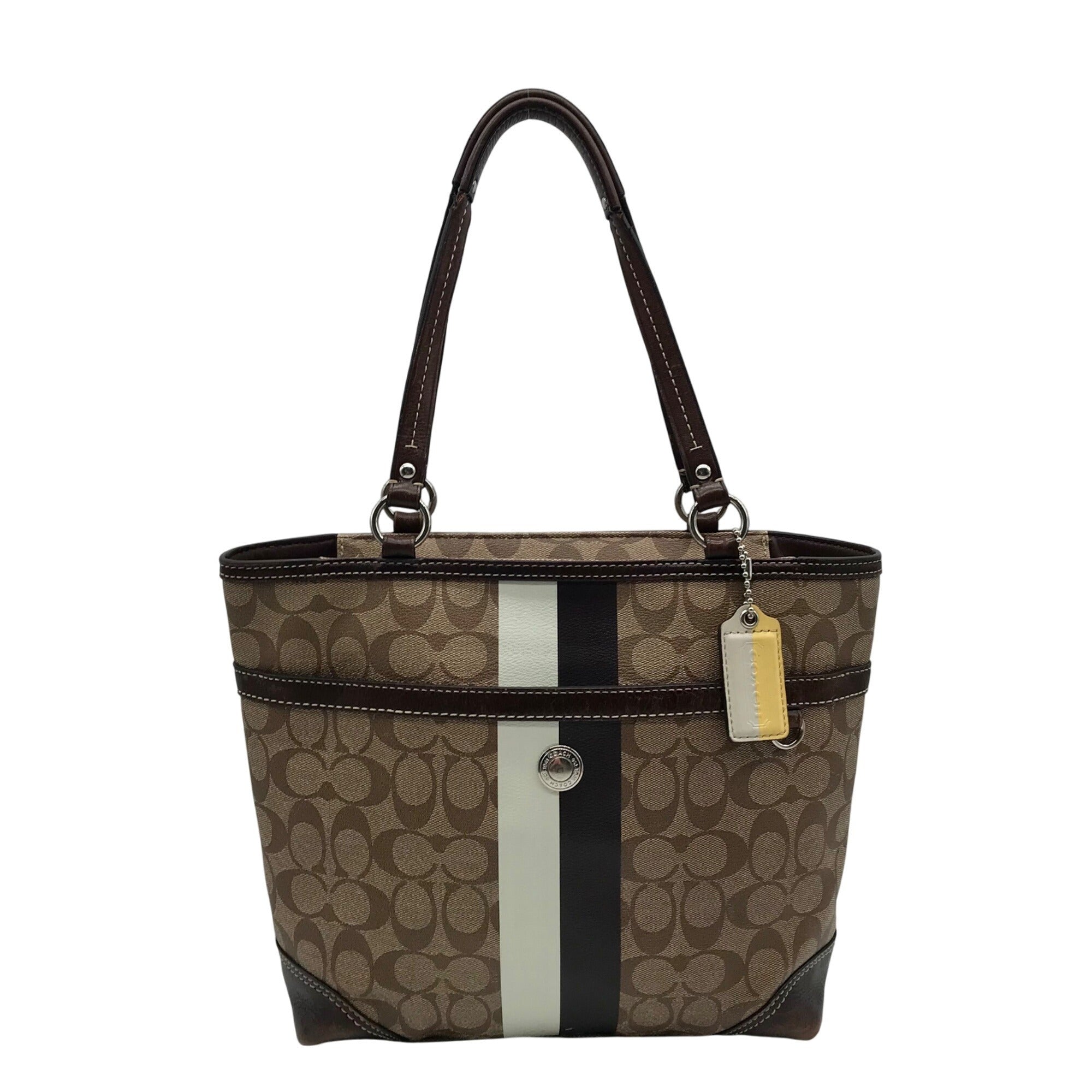 Coach Brown Coated Monogram Canvas Heritage Stripe Tote Bag F14477